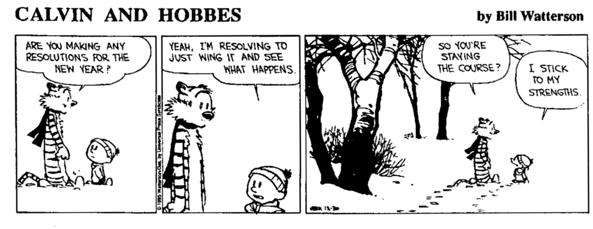 Looking at a little one now, when he hears: 'Such a darling. No problems here’, He says, ‘Run, my dear’, There is much to fear You are born of them, Not to be their poodle Or to make them proud— As life’s expression and will— Be whoever you are meant to be Not just what they want you to be You are a kid, cracks, creases, and edges, all— For now, you can do little but kick and bawl And hope folks mature and bear it all. Image: New Years Resolutions, Calvin & Hobbes, The Ukiah California Daily Journal, December 31, 1995